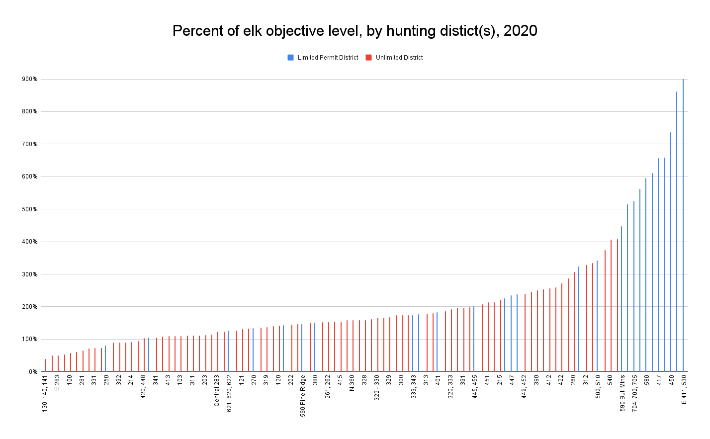 Elk populations are chronically over objective in most hunting districts around the state. The 2020 Elk Counts put statewide population around 170,000 animals. Populations are over objective in 77 of the 105 districts counted. The statewide elk population has increased by about 25% since the inception of the current Elk Management Plan in 2004.